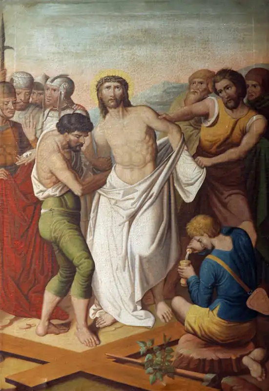 The soldiers notice you have something of value. They remove your cloak and throw dice for it. Your wounds are torn open once again. Some of the people in the crowd make fun of you. They tease you and challenge you to perform a miracle for them to see. They're not aware that you'll perform the greatest miracle of all. Sometimes I repeat stories that are disrespectful of others. I can entertain thoughts that are not clean. Sometimes I give the young people around me a bad example to follow. Help me to keep myself pure and clean. Help me say things that build up the people around me. Help me overcome worldly desires that I may become more like Jesus. Help me set a good example for others to follow. My Jesus, stripped of Thy garments and drenched with gall, strip me of love for things of earth, and make me loathe all that savors of the world and sin.