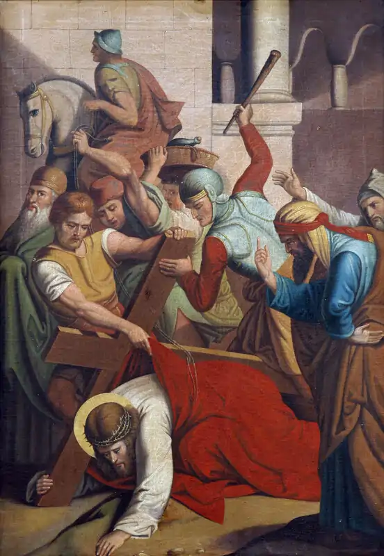 Jesus, the cross you have been carrying is very heavy. You are becoming weak and almost ready to faint, and you fall down. Nobody seems to want to help you. The soldiers are interested in getting home, so they yell at you and try to get you up and moving again. As a child, sometimes I start to do something, but then get tired of it. I hurry to get finished and sometimes don't do my work well. Sometimes I don't pay attention to what I should be doing. When things get hard for me, sometimes I give up. As an adult, I sometimes put things off. I give up too easily, and sometimes don't do my work as well as I know I can. My Jesus, the heavy burden of my sins is on Thee, and bears Thee down beneath the cross. I loathe them, I detest them; I call on Thee to pardon them; may Thy grace aid me never more to commit them.
